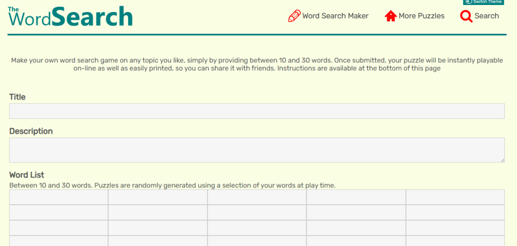 TheWordSearch.com offers a straightforward free word search maker that generates puzzles quickly without requiring an account.